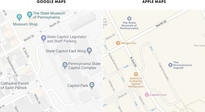 Meanwhile, Apple Maps lacks these details for even larger cities, such as Pennsylvania’s state capital, Harrisburg (below).