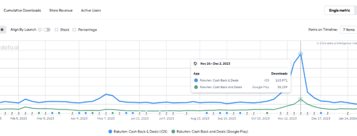 * Rakuten downloads showed an all-time high near the end of 2023 followed by continuous download growth in Q1 2024. Source: data.ai