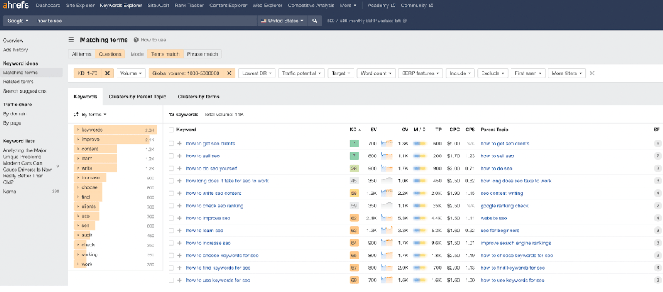 Using Ahrefs’ Keywords Explorer, we can see that relevant terms can be ranked by ‘keyword difficulty,’ which is a metric that assesses how tricky it would be to rank among Google’s top 10 search results when including the keyword in online content.