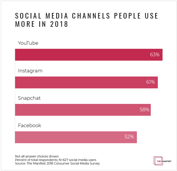 - People use several social media channels more in 2018 than they did in 2017, including YouTube (63%), Instagram (61%), Snapchat (58%), and Facebook (52%).